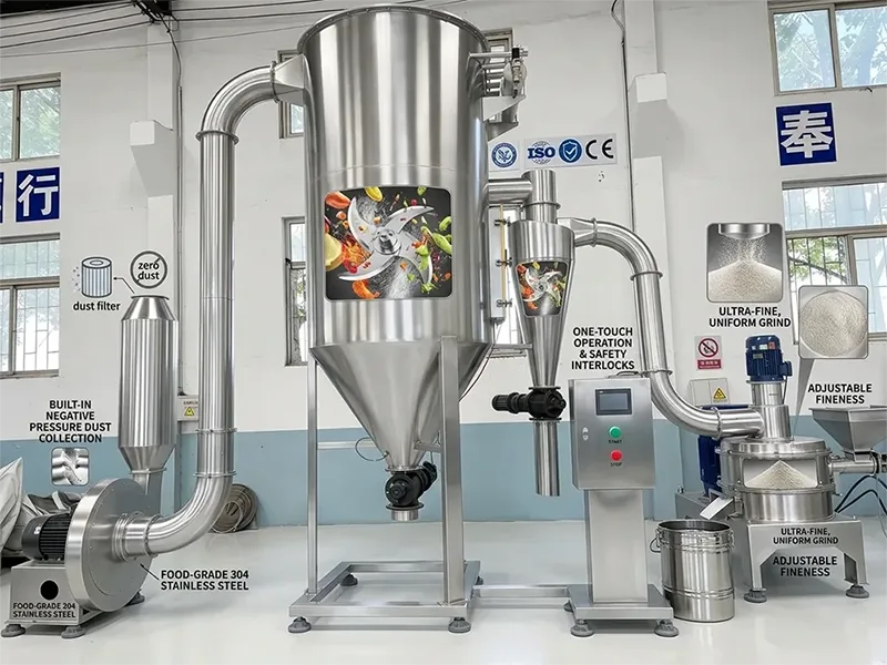 4. Безопасно и экологично, в соответствии со стандартами: вся машина имеет полностью герметичную конструкцию, не допускающую утечки пыли, что делает рабочую среду более чистой и строго соответствует экологическим требованиям; Сочетание материалов пищевого качества и стандартного дизайна GMP гарантирует, что измельченный фруктовый и овощной порошок не имеет запаха и не загрязняет окружающую среду, а также может быть непосредственно использован в высокотехнологичных сценариях, таких как пищевая промышленность и производство товаров для здоровья; Рабочий шум оборудования контролируется в разумных пределах и не создает помех для окружающей среды.
