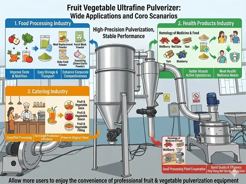 1. Пищевая промышленность: его можно использовать для производства порошка-заменителя еды из фруктов и овощей, порошка для маски для лица из фруктов и овощей, порошка для пищевых добавок для детского питания, приправ (таких как луковый порошок, чесночный порошок) и других продуктов. Измельченный ультратонкий порошок можно добавлять непосредственно для использования, что может не только улучшить вкус и пищевую ценность продуктов, но также облегчить хранение и транспортировку, помогая пищевым предприятиям повысить конкурентоспособность продукции.