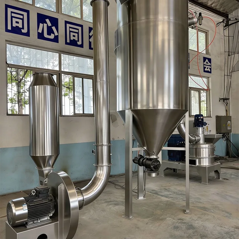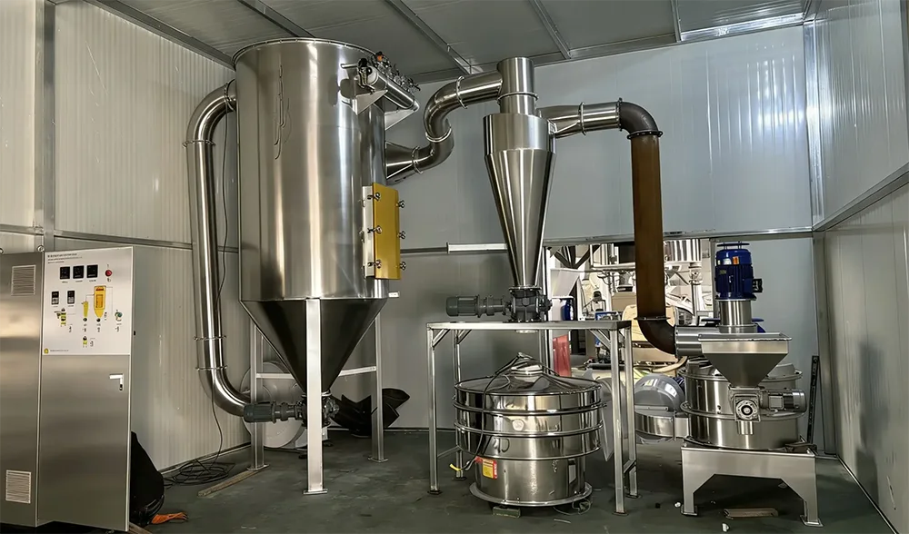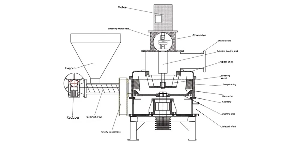 Конкретный процесс обработки прост: сначала крупнозернистый порошкообразный материал с размером частиц не более 10 мм подается в загрузочный бункер, а затем транспортируется в камеру дробления с постоянной скоростью через питатель переменной частоты; Шлифовальный диск в камере измельчения вращается с высокой скоростью, заставляя шлифовальный молоток и шлифовальный ролик работать синхронно на высокой скорости, создавая сильную центробежную силу и выбрасывая крупнозернистый порошкообразный материал во внутреннюю стенку камеры измельчения; Под действием центробежной силы сырье подвергается сильным ударам, сдвигу и трению об износостойкие облицовочные плиты, дробильные молотки и дробильные ролики, завершая предварительное дробление; После первоначального дробления материал подается в камеру классификации потоком воздуха отрицательного давления, создаваемым вытяжным вентилятором. Колесо классификации в камере классификации вращается с высокой скоростью для точной классификации в зависимости от размера частиц. Ультратонкий порошок, соответствующий требованиям (размер частиц можно регулировать по мере необходимости), будет поступать в коллектор потоком воздуха для завершения сбора; Грубый порошок, не соответствующий требованиям по размеру частиц, будет перехватываться сортировочным колесом и отправляться обратно в камеру дробления для вторичного дробления до тех пор, пока он не достигнет указанного стандарта размера частиц, обеспечивая однородность готового порошка.