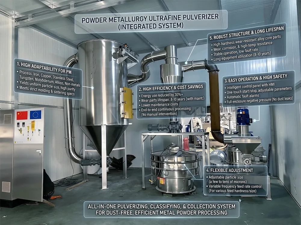 Ультратонкий измельчитель для порошковой металлургии — это специализированное оборудование, разработанное специально для отрасли порошковой металлургии. Он в основном используется для сверхтонкой обработки металлических порошков, порошков сплавов и различного неметаллического порошкового сырья и может идеально адаптироваться к требованиям обработки сырья в рамках всего производственного процесса порошковой металлургии. По сравнению с обычным дробильным оборудованием, наиболее заметной особенностью сверхтонкого измельчителя для порошковой металлургии является его соблюдение строгих стандартов отрасли порошковой металлургии, что позволяет точно контролировать размер частиц порошка, обеспечивать равномерное распределение частиц и полностью избегать вторичного загрязнения, обеспечивая высокую чистоту готового порошка и полностью отвечая основным требованиям последующего формования, спекания и других процессов.