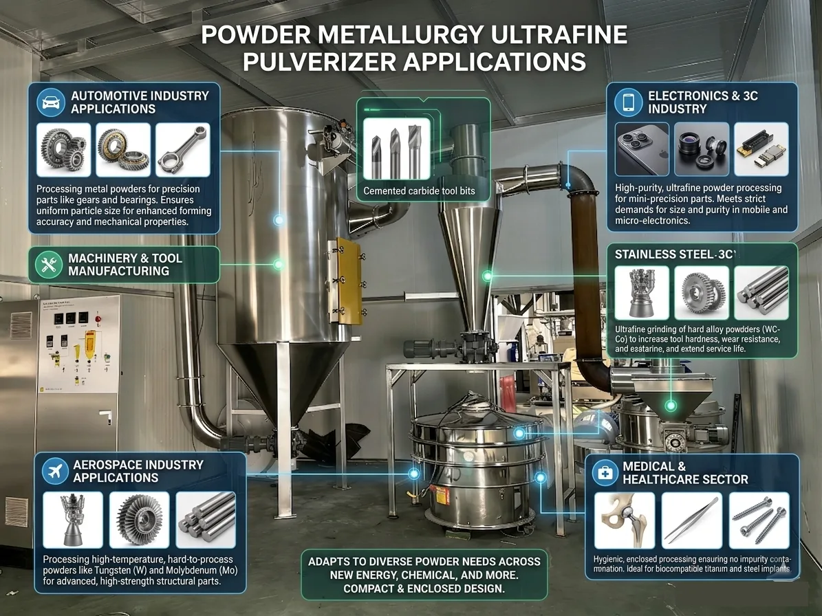 Ультратонкий измельчитель для порошковой металлургии в основном используется для сверхтонкой обработки сырья во всей отрасли порошковой металлургии и может адаптироваться к дроблению различных порошков металлов, сплавов и неметаллов. Он широко используется во многих областях, таких как автомобилестроение, машиностроение, электроника, аэрокосмическая промышленность, медицина и производство инструментов. Конкретные сценарии применения следующие: